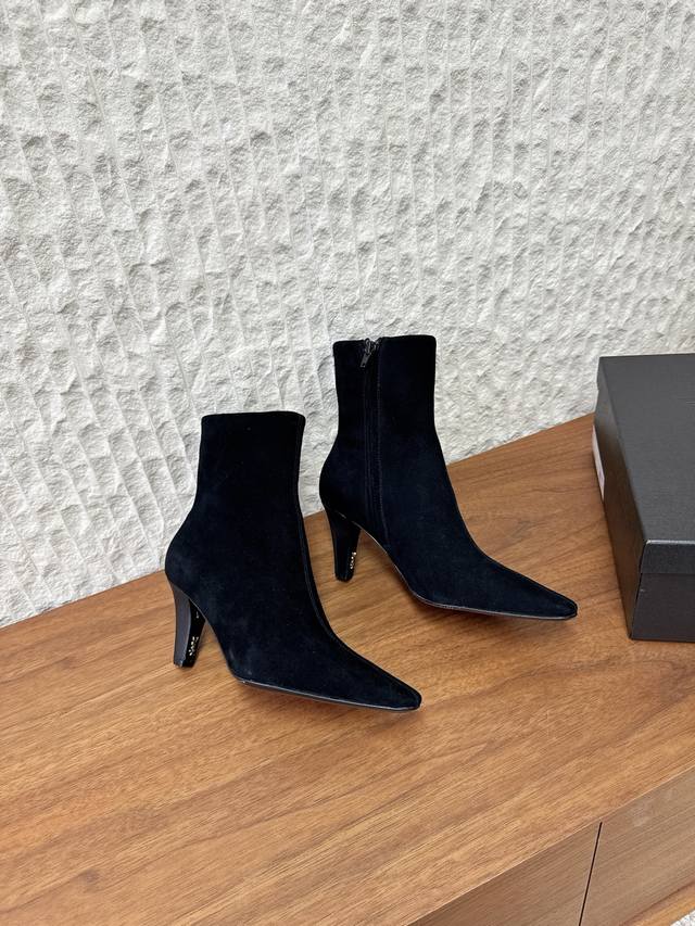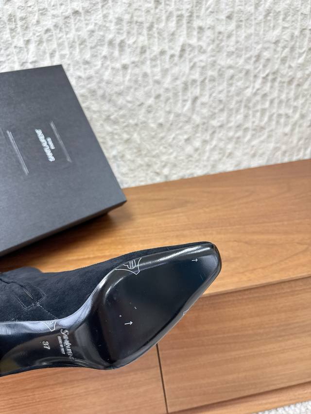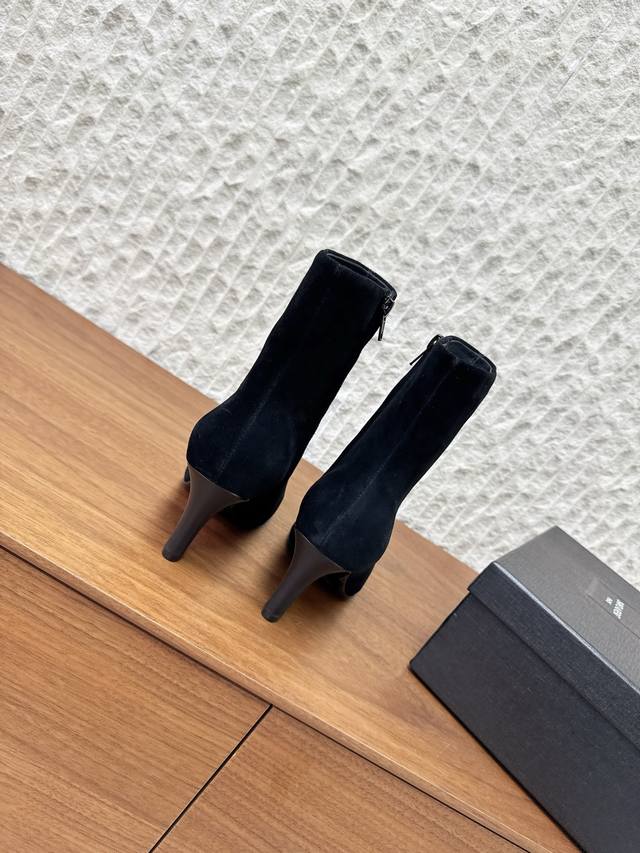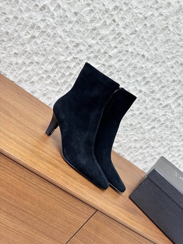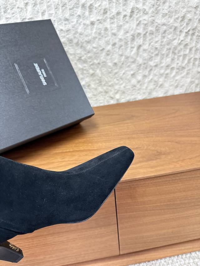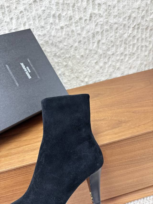 G731 Saint Laurent 25Ss Fall/Winter New Side Zipper High-Heeled Ankle Boots. The entire shoe is very simple and elegant. The small square toe adds a touch of sophistication and style. You can see that the side of the boot is designed to conform to the curve of the human leg shape. It looks very flattering and suits everyone. It elongates the legs and is suitable for various occasions. A must-have item for fall/winter outfits! Upper: Made of original imported cowhide suede. Insole: Sheepskin. Heel height: 7.5cm. Sole: Original custom-made Italian genuine leather outsole. Sizes: 35-39. Size 40 is custom-made and non-refundable.