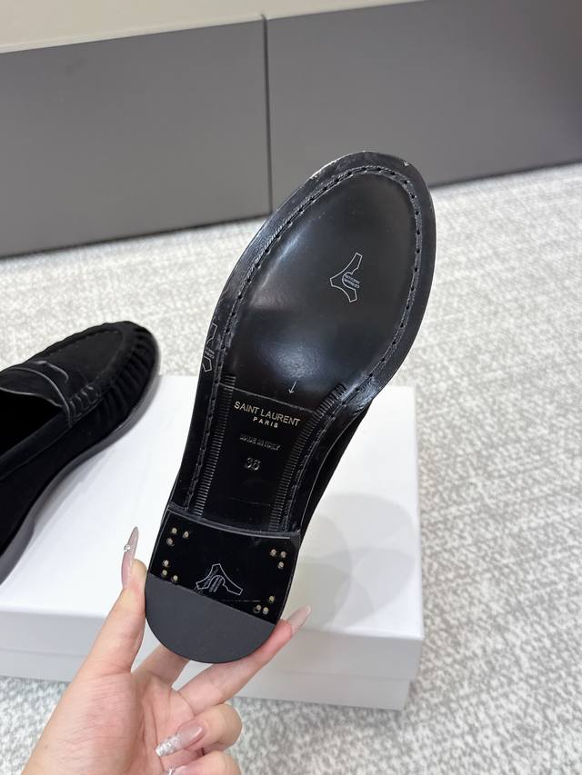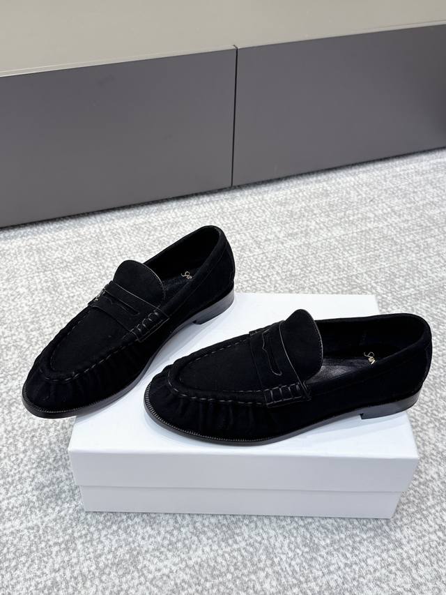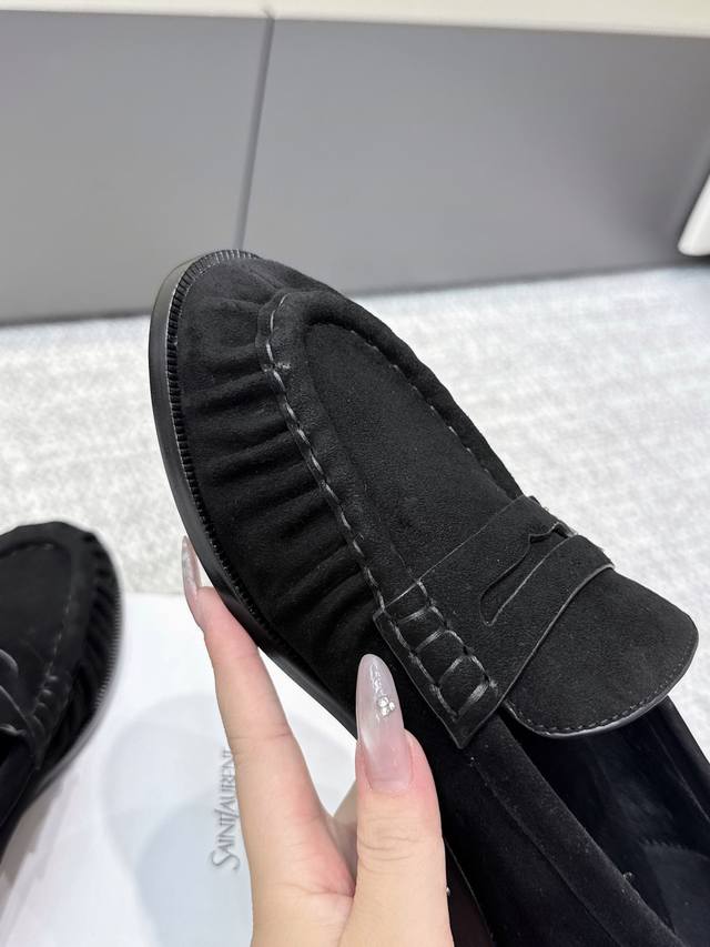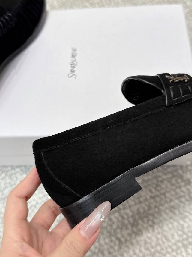 High-quality Yves Saint Laurent 25Ss new YSL small logo loafers. The iconic small logo is the soul of these shoes, presented with a low-key yet refined style. Unlike the ostentatious large logo, it is quiet yet eye-catching, outlining YSL's unique fashion with simple lines, subtly revealing the brand's profound heritage. The classic almond-shaped design of the toe cleverly flatters the foot shape, visually lengthening the foot line and highlighting elegance and delicacy. Whether paired with simple wide-leg pants or a playful mini skirt, it can easily showcase different styles, becoming the finishing touch to any outfit. Material: Original custom leather; Lining: Sheepskin insole; Outsole: Italian imported genuine leather; Size: 35-39, 40, 41 (customized).