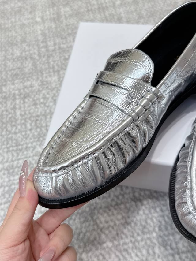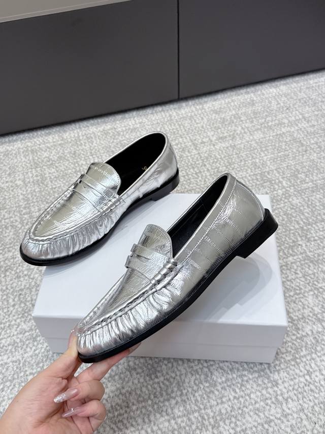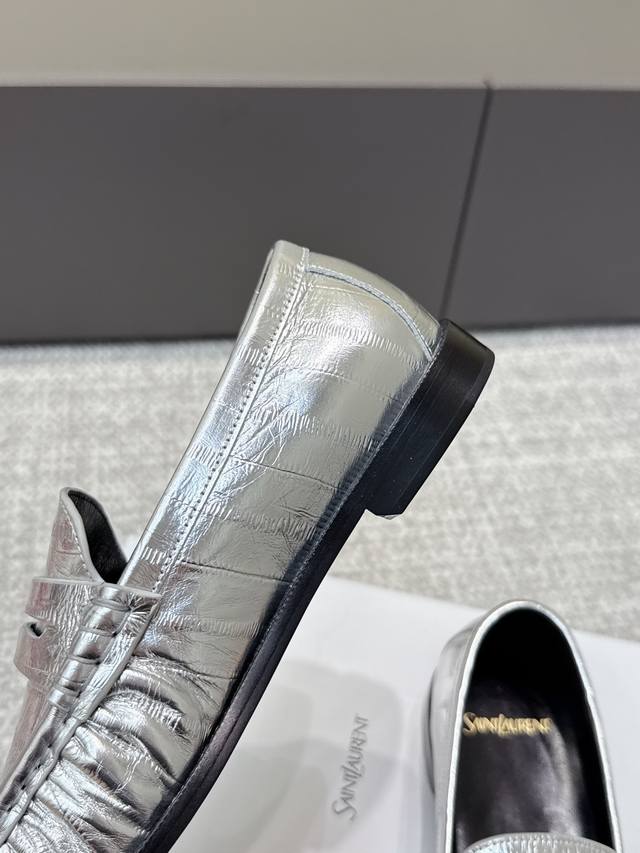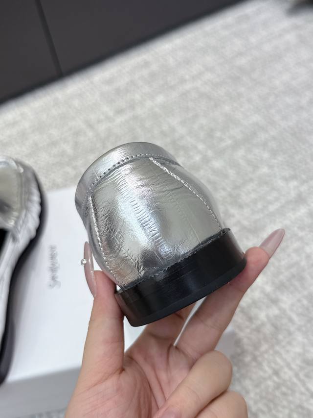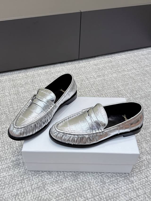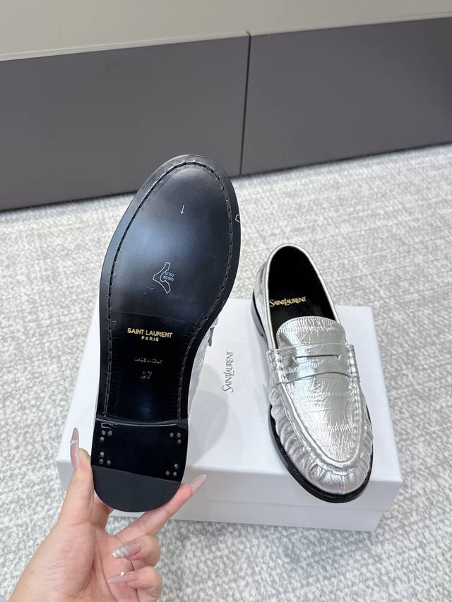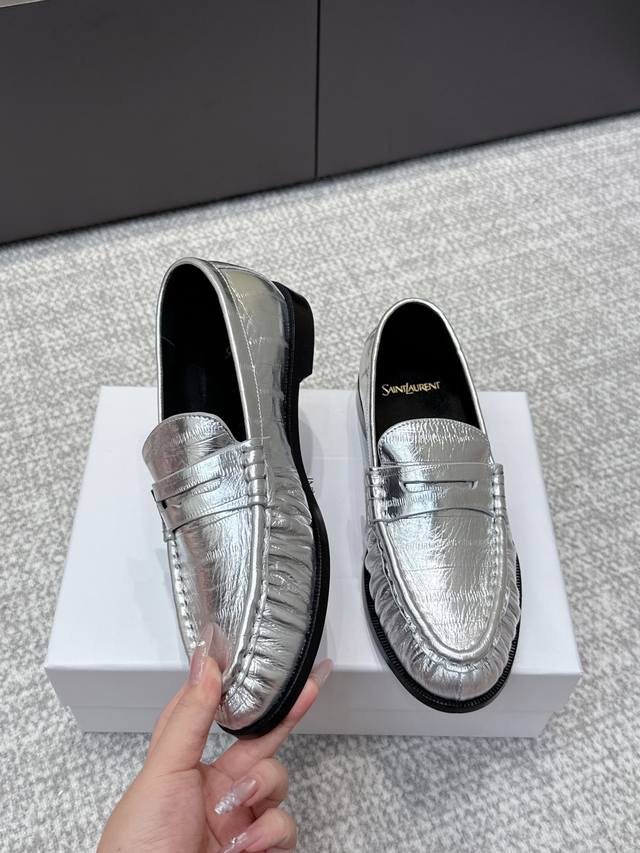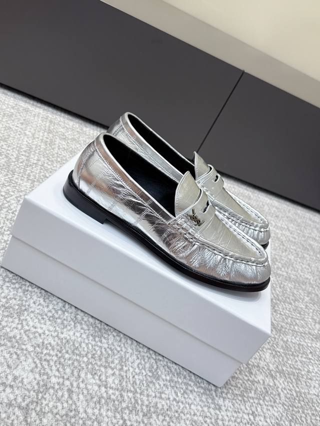 High-quality Yves Saint Laurent 25Ss new YSL small logo loafers. The iconic small logo is the soul of these shoes, presented with a low-key yet refined style. Unlike the ostentatious large logo, it is quiet yet eye-catching, outlining YSL's unique fashion with simple lines, subtly revealing the brand's profound heritage. The classic almond-shaped design of the toe cleverly flatters the foot shape, visually lengthening the foot line and highlighting elegance and delicacy. Whether paired with simple wide-leg pants or a playful mini skirt, it can easily showcase different styles, becoming the finishing touch to any outfit. Material: Original custom leather; Lining: Sheepskin insole; Outsole: Italian imported genuine leather; Size: 35-39, 40, 41 (customized).