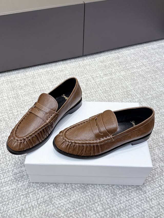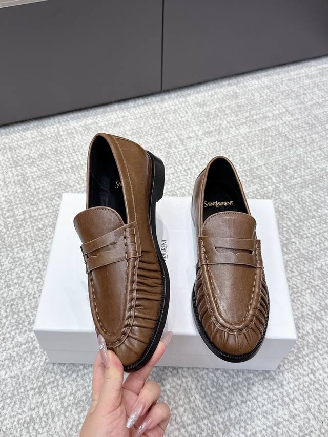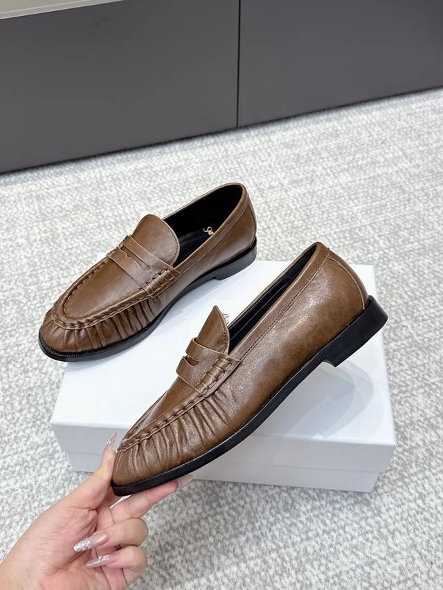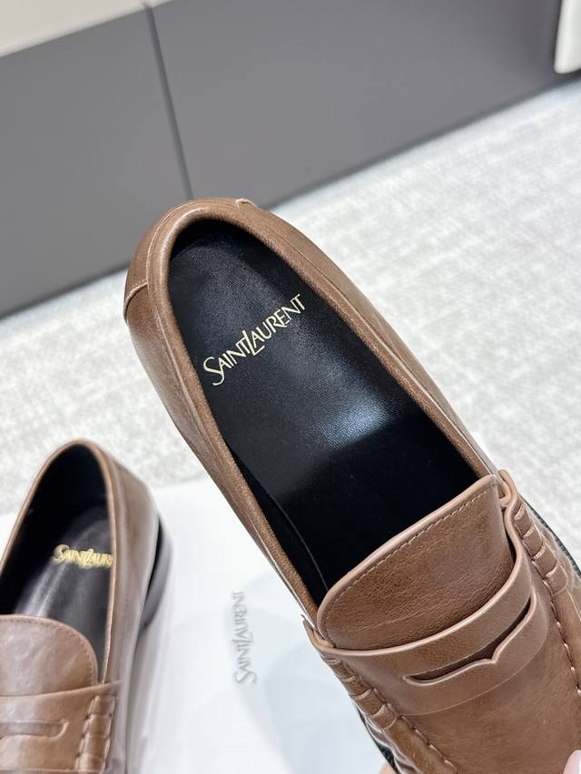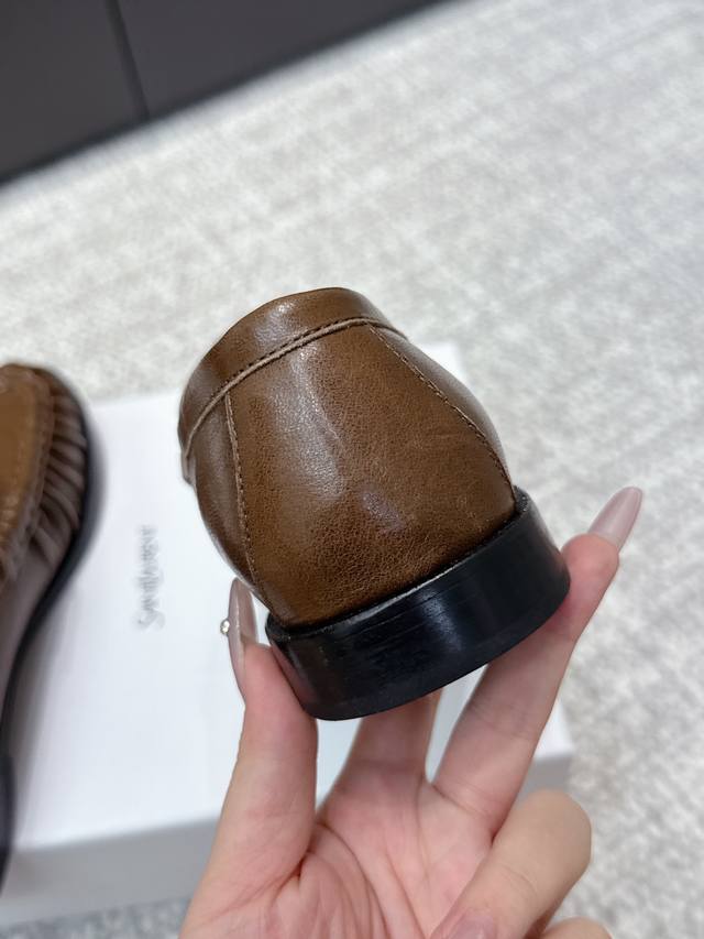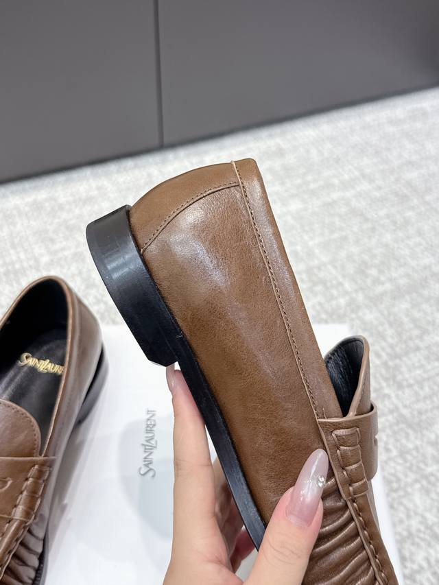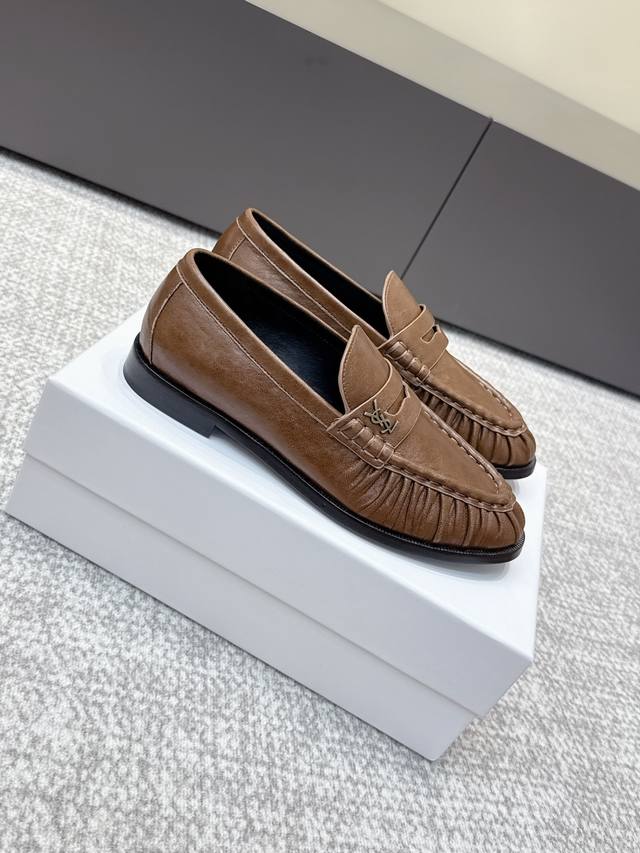 High-quality Yves Saint Laurent 25Ss new YSL small logo loafers. The iconic small logo is the soul of these shoes, presented with a low-key yet refined style. Unlike the ostentatious large logo, it is quiet yet eye-catching, outlining YSL's unique fashion with simple lines, subtly revealing the brand's profound heritage. The classic almond-shaped design of the toe cleverly flatters the foot shape, visually lengthening the foot line and highlighting elegance and delicacy. Whether paired with simple wide-leg pants or a playful mini skirt, it can easily showcase different styles, becoming the finishing touch to any outfit. Material: Original custom leather; Lining: Sheepskin insole; Outsole: Italian imported genuine leather; Size: 35-39, 40, 41 (customized).