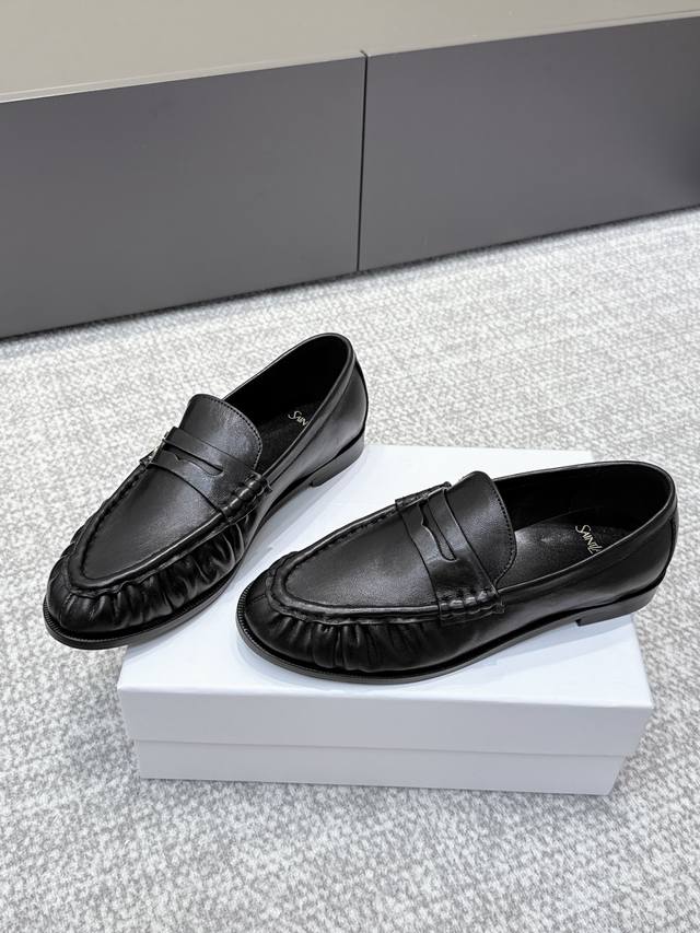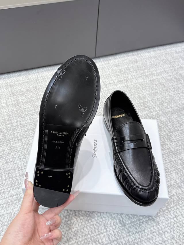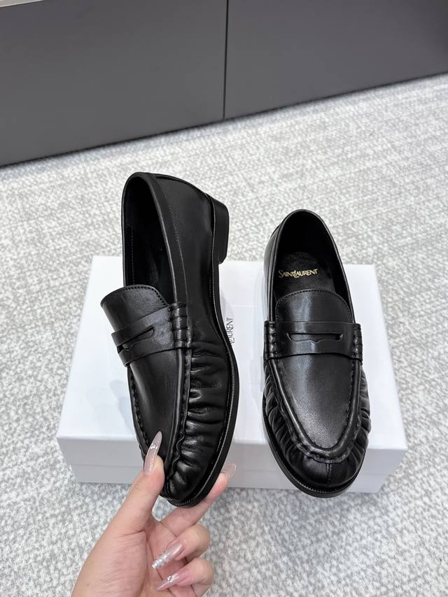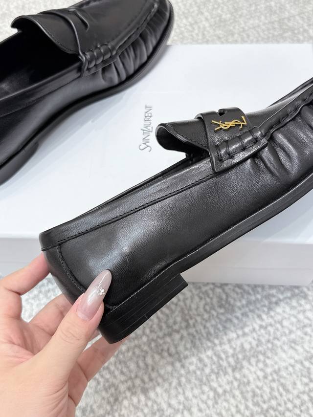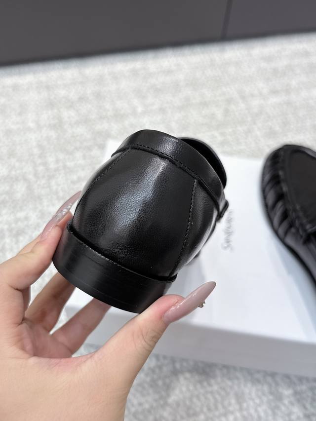 High-quality Yves Saint Laurent 25Ss new YSL small logo loafers. The iconic small logo is the soul of these shoes, presented with a low-key yet refined style. Unlike the ostentatious large logo, it is quiet yet eye-catching, outlining YSL's unique fashion with simple lines, subtly revealing the brand's profound heritage. The classic almond-shaped toe design cleverly flatters the foot shape, visually elongating the foot and highlighting elegance and delicacy. Whether paired with simple wide-leg pants or a playful mini skirt, it can easily showcase different styles, becoming the finishing touch to any outfit. Material: Original custom leather; Lining: Sheepskin insole; Outsole: Italian imported genuine leather; Size: 35-39, 40, 41 (customized).