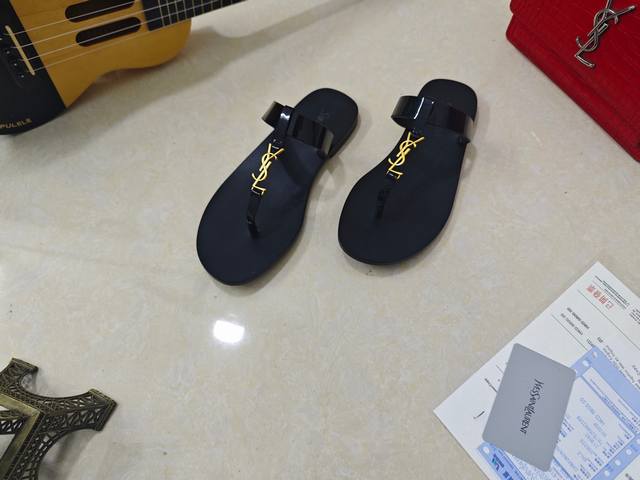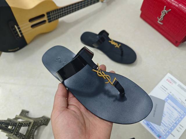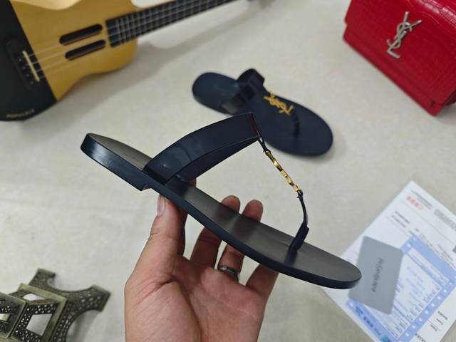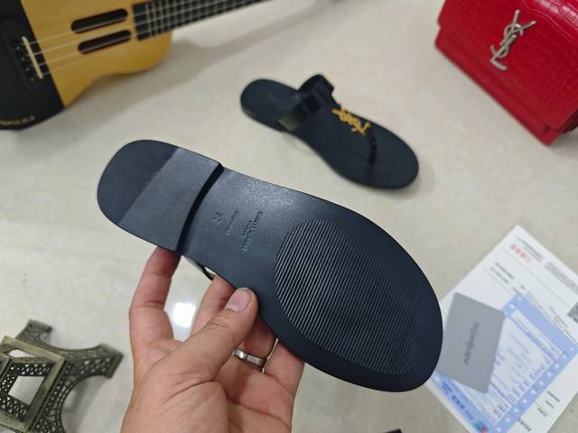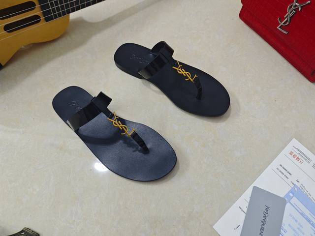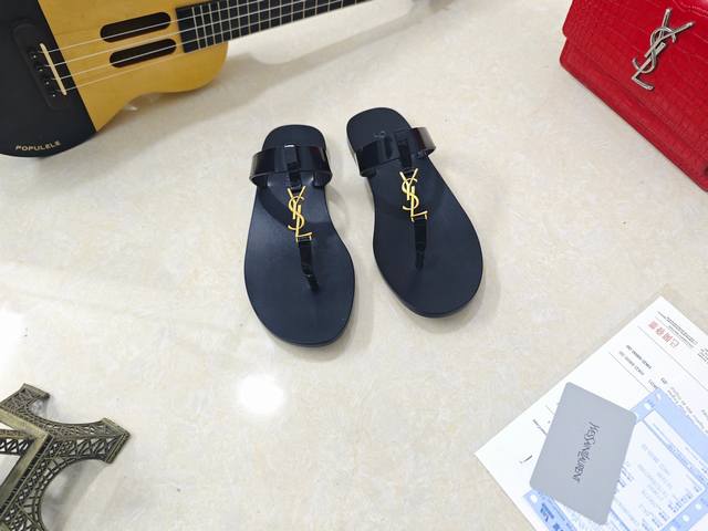 Saint Laurent flat flip-flops, the latest 2025 early spring counter release, featuring Ysl logo buckle embellishments. A classic, premium masterpiece from the hottest spring/summer collection, this style combines elegance and style with a classic, enduring design. The buckle is gold and the material is Italian imported black calfskin, black patent leather, and brown. Classic craftsmanship includes a sheepskin lining and footbed. Sizes 34-41. Sizes 34, 41, and 42 must be custom-made and are non-refundable. The sole is imported rubber and comes with full counter packaging.