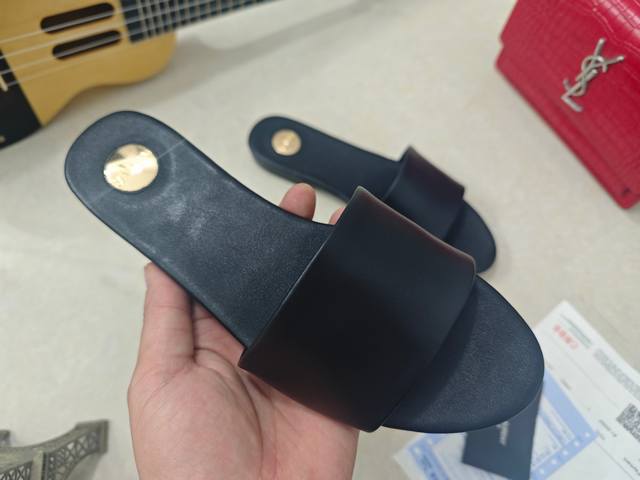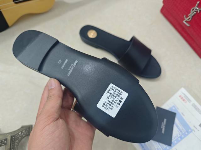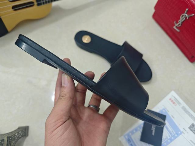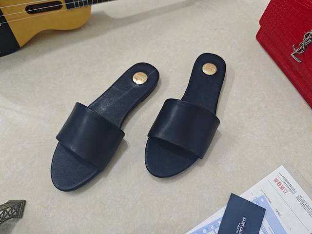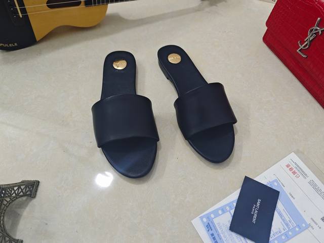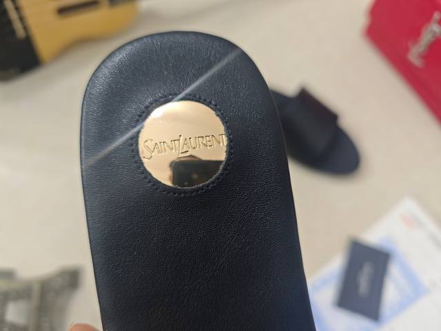 Saint Laurent flat slip-on sandals, the latest 2025 early spring counter release, featuring Ysl logo and diamond buckle decoration.