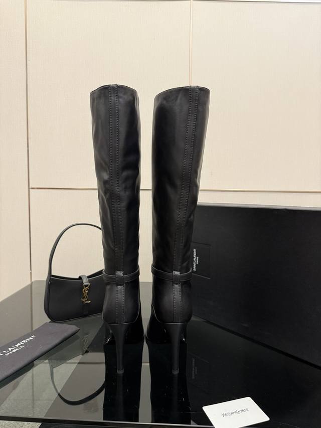 Saint Laurent High-Heeled Boots with Gold Logo Buckle, Pointed Toe Design Makes