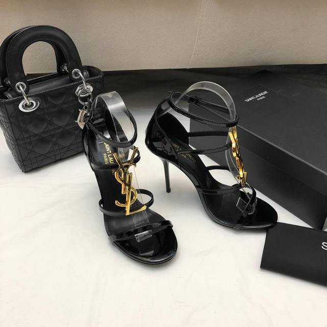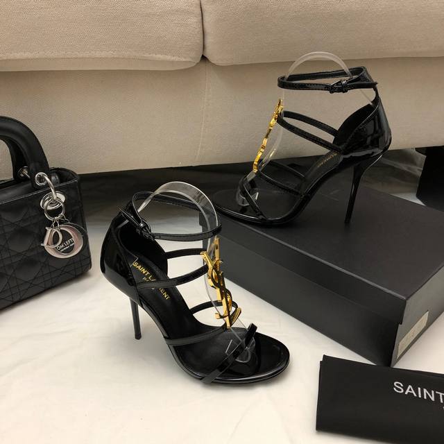Saint Laurent YSL metal buckle lacquered high-heeled sandals. The distinctive YSL buckle design creates a unique and distinctive style. Imported patent leather mixed with sheepskin, water-dyed sheepskin lining, and Italian leather outsole. Heel height: 10.5cm. Sizes: 35-40, 34, 41, 42. Made to order, no returns or exchanges.