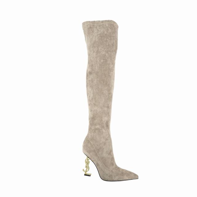 Saint Laurent YSL Women's Stretch Over-the-Knee Boots. Features: Italian genuine leather outsole. Sizes: 35-42. Material and Fit: Made of light brown stretch suede, these boots closely conform to the leg line, providing an excellent slimming effect. The over-the-knee design elongates the legs, creating an elegant and sophisticated look. Brand Logo: The heel features the iconic gold YSL logo, serving both as a support structure and a classic representation of the brand, making it highly recognizable and luxurious. Shoe Details: The pointed toe design further extends the visual length of the legs; the stiletto heel, combined with the unique design of the brand logo, ensures a fashionable look while also showcasing thoughtful design and a stylish expression. The overall look is modern and sophisticated, making it a powerful tool for creating a commanding presence.
