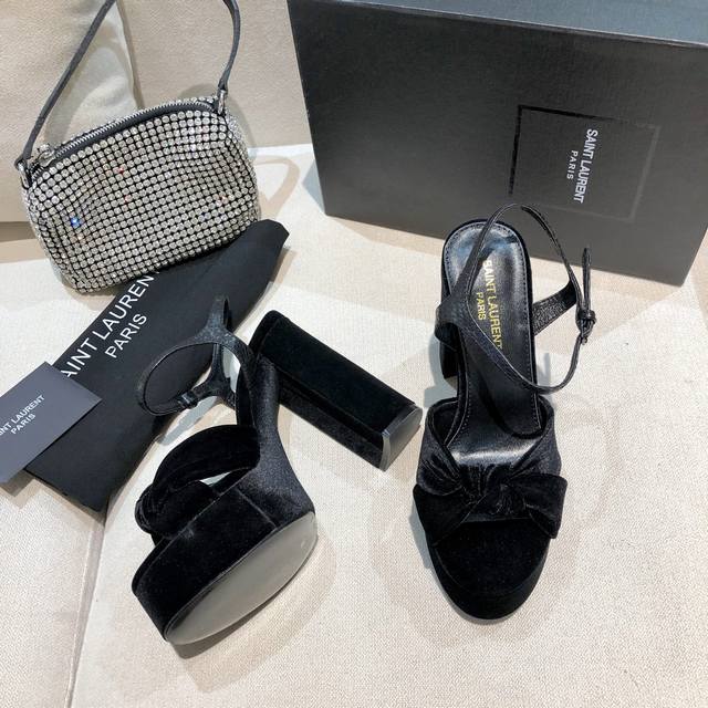 Saint Laurent's signature waterproof platform sandals are incredibly high, featuring a bow. High-end custom craftsmanship and premium quality. Continuing the family's classic bow design, the shoes boast a simple and elegant design. The platform and block heel are effortlessly stylish, and the distinctive extended back strap allows for easy lacing, enhancing the shoes' sensual, sweet, and feminine charm. Upper: Imported Grade A cowhide, Italian velvet. Outsole: Italian cowhide. Insole: Imported sheepskin. Heel Height: 12.5cm. Platform: 4cm. Sizes: 35-40, 41. Made to order, no returns or exchanges. Colors: Heart Red, High-End Apricot, Imported Black Velvet Snake-Pattern Back Strap, Black Sheepskin!