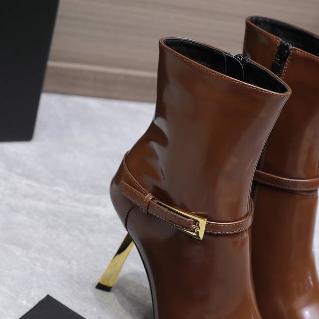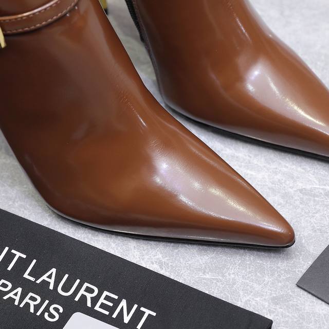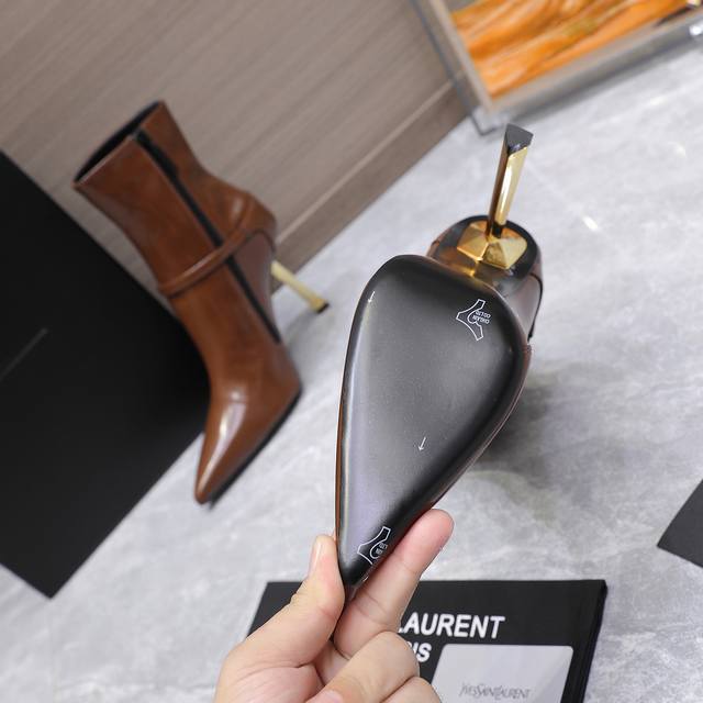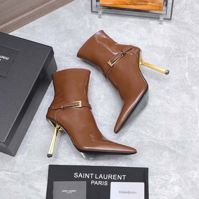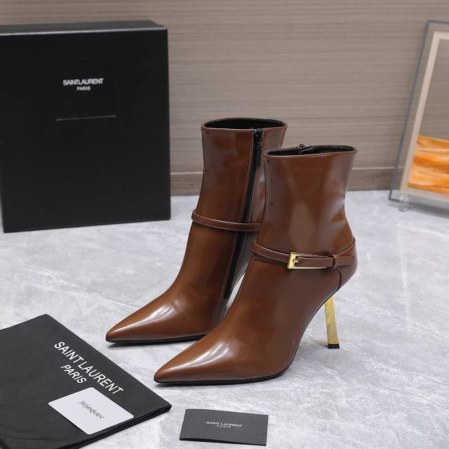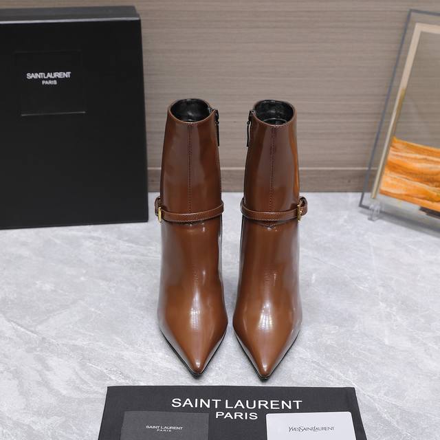 Top-quality Saint Laurent YSL pointed-toe ankle boots. The highlight of these YSL boots is their unique square pointed toe, creating a strong visual impact and adding to your charm. The design is like the finishing touch, shining brightly. Upper: Top-grain cowhide. Lining: Water-dyed goatskin. Outsole: Italian genuine leather. Heel height: 10.5cm. Sizes: 35-42 (41, 42). Custom orders are non-refundable. Price: [Price not specified]