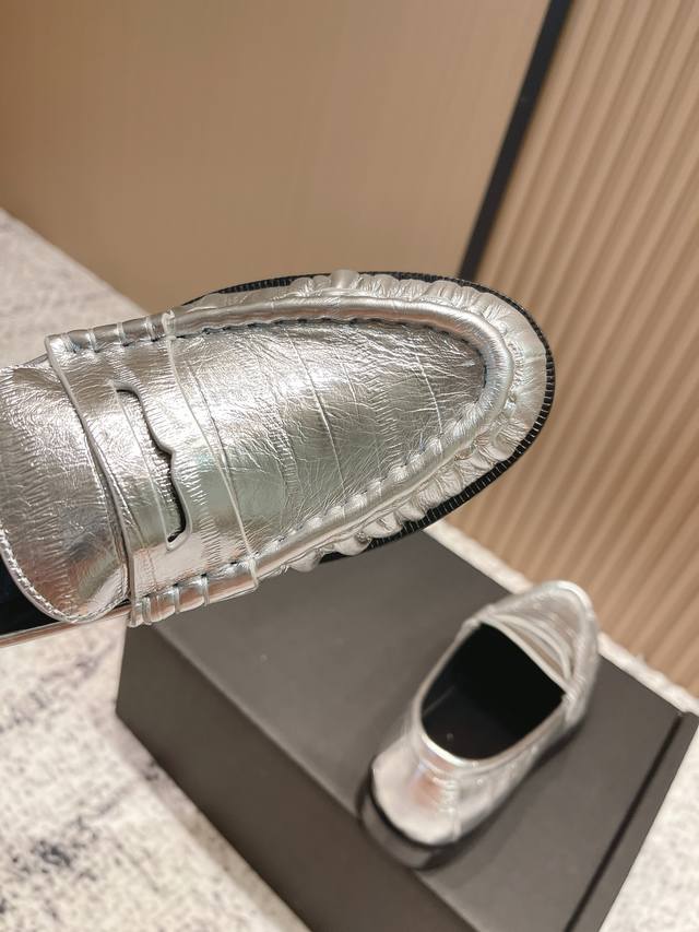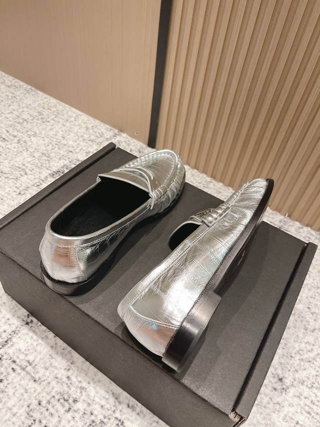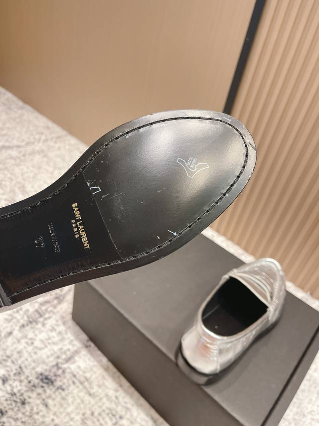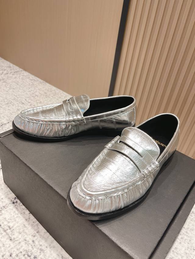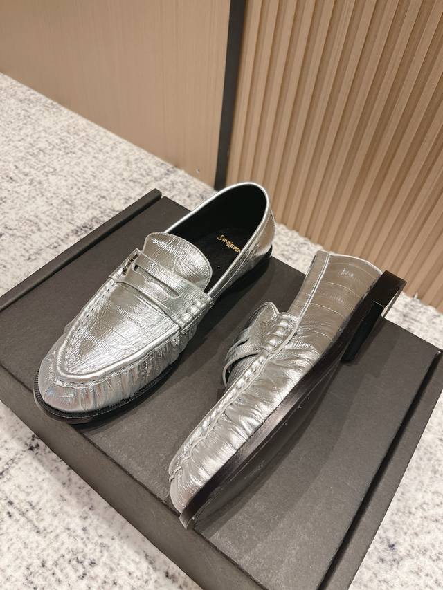 Top-tier version: Full-length Sain Laurent 2025 Early Spring New Arrival Le Loafer Pleated Loafers, new arrival! A stunning top-tier YSL shoe, debuting with a completely new interpretation! Minimalist design, incredibly flattering for the legs, retro and stylish. Looks great with any outfit! Upper: High-quality custom imported high-gloss cashmere cowhide patent leather. Lining: Imported goatskin lining. Outsole: Italian genuine leather outsole. Heel height: 2cm. Sizes: 35-40, 40 (custom sizes available).