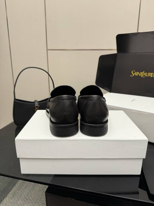 Women's Size: Men's Size: 350 Saint Laurent*YSL 25Ss New Arrival YSL Small Logo Loafers The iconic small logo is the soul of this shoe, presented on the shoe body with a low-key yet exquisite style. Unlike the ostentatious large logo, it is quiet yet eye-catching. Simple lines outline YSL's unique fashion sense, subtly revealing the brand's profound heritage. The classic almond-shaped design of the toe cleverly modifies the foot shape, visually lengthening the foot line and highlighting elegance and delicacy. Whether paired with simple wide-leg pants or a playful mini skirt, it can easily showcase different styles and charm, becoming the finishing touch in any outfit.