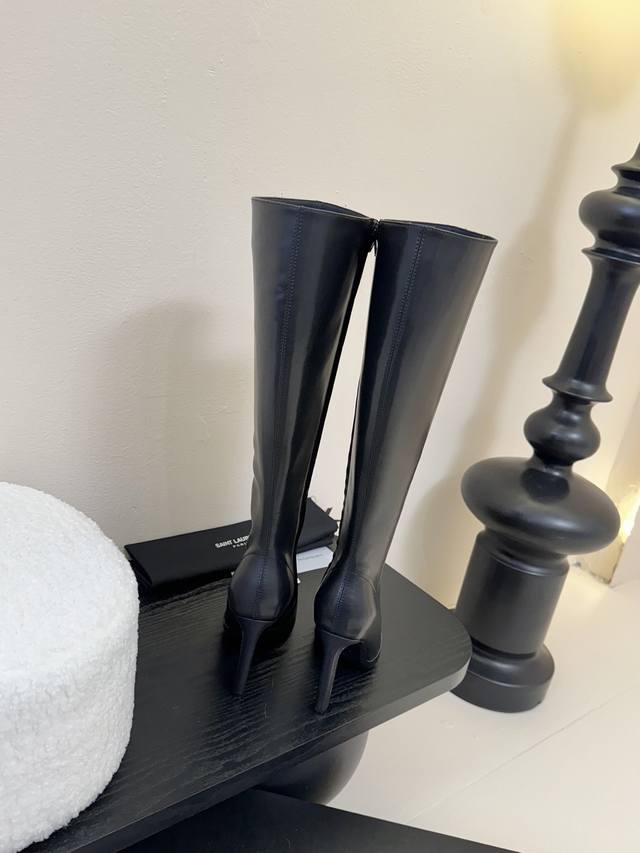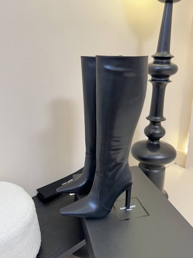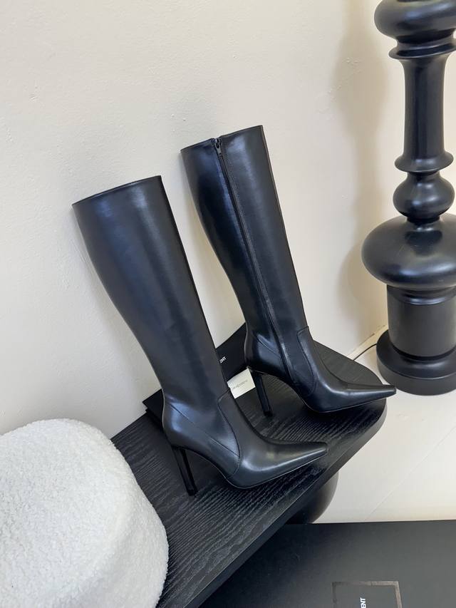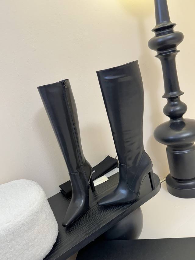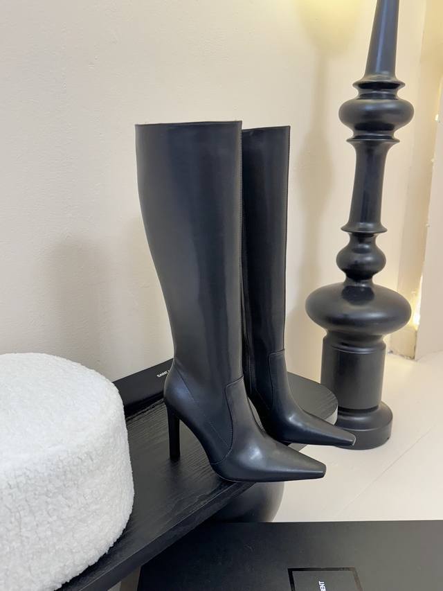 . The pointed toe and stiletto heel complement each other, adding to the boots' elegance and comfort. In addition, the black split-edge leather outlines the slender lines of the legs while providing excellent wrapping. The toughness is not lost on the feminine temperament. The zipper on the inside of the boot makes it easier to put on and take off, giving this beautiful autumn and winter of 2025 a touch of romanticism.
